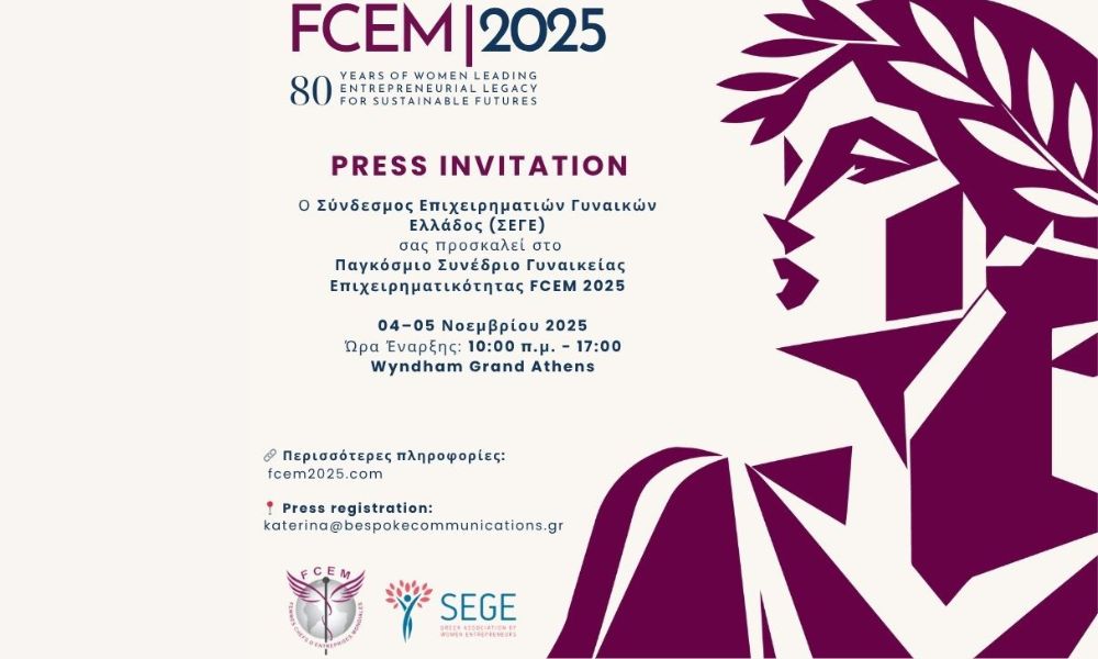 Ο Σύνδεσμος Επιχειρηματιών Γυναικών Ελλάδος (ΣΕΓΕ) υποδέχεται από τις 4& 5 Νοεμβρίου 2025 στην Αθήνα, στο Wyndham Grand Athens, το Παγκόσμιο Συνέδριο Γυναικείας Επιχειρηματικότητας – FCEM World Congress 2025, τη σημαντικότερη διεθνή διοργάνωση για τη γυναικεία ηγεσία και επιχειρηματικότητα.