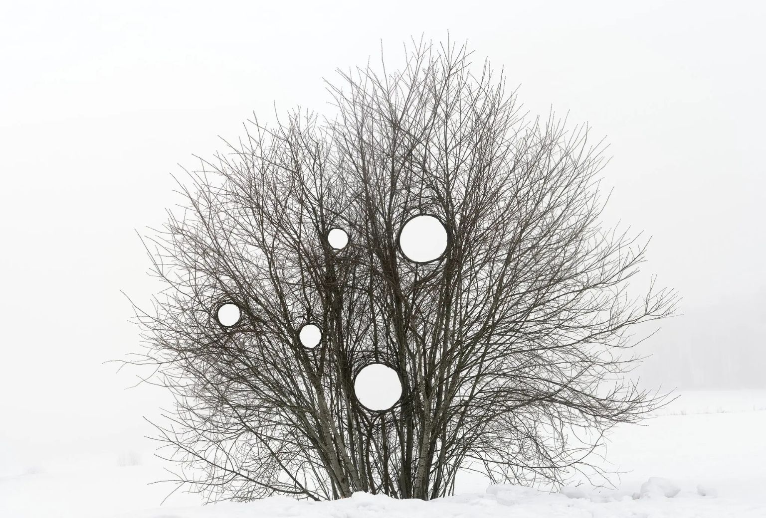 Παράλληλα, ο Laitinen παρουσιάζει και έργο από τη σειρά «Broken Landscape», όπου παρεμβαίνει στα δέντρα δημιουργώντας κυκλικά ανοίγματα, καλώντας τον επισκέπτη να δει το τοπίο με διαφορετική οπτική.
